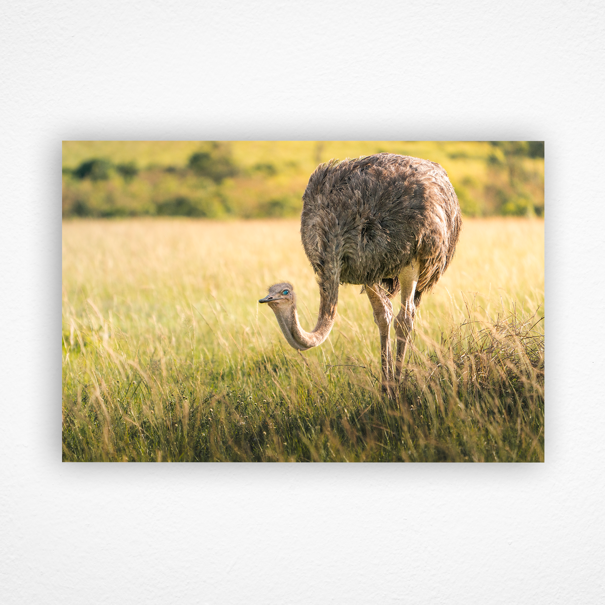 Seule dans l’immensité, une autruche abaisse la tête pour se nourrir, avant de relever son regard, perçant et intense. Ce sont ses yeux qui m’ont frappé : un bleu profond, éclatant, presque irréel. Lorsqu’on pense safari, on s’attarde rarement sur ces oiseaux majestueux, et pourtant… Derrière leur stature imposante se cache une grâce insoupçonnée, une beauté surprenante. Une œuvre qui rend hommage au plus grand oiseau de la terre, trop souvent éclipsé, et pourtant fascinant.